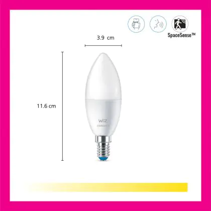 Die Doppelpack 2x WiZ Smart LED E14 Kerze Matt 5W 470lm | Höchste Farbwiedergabe - Dimmbar - Ersatz Für 40W ist eine effiziente E14 LED-Lampe und der perfekte Ersatz für Ihre konventionellen 40W Lampen mit E14-Sockel. Zudem strahlt sie Licht in der Farbtemperatur aus und punktet durch eine lange Lebensdauer.