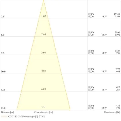 Der Abstrahlwinkel bezeichnet den Winkel, in dem das Licht aus der Lichtquelle ausgestrahlt wird. Er wird in Grad (D) angegeben. Je geringer die Gradzahl des Abstrahlwinkels ist, desto kleiner ist auch der Durchmesser des Lichtkegels, den die Lichtquelle produziert. Beispiel: Wird eine Lampe mit einem Abstrahlwinkel von 60 Grad an der Decke (2,5 m Höhe) angebracht, erzeugt sie einen Lichtkegel von 2,9 Metern Durchmesser. Hat die Lampe hingegen einen Abstrahlwinkel von 120 Grad, beträgt der Lichtkegel 8,7 Meter im Durchmesser. |