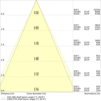 Der Abstrahlwinkel bezeichnet den Winkel, in dem das Licht aus der Lichtquelle ausgestrahlt wird. Er wird in Grad (D) angegeben. Je geringer die Gradzahl des Abstrahlwinkels ist, desto kleiner ist auch der Durchmesser des Lichtkegels, den die Lichtquelle produziert. Beispiel: Wird eine Lampe mit einem Abstrahlwinkel von 60 Grad an der Decke (2,5 m Höhe) angebracht, erzeugt sie einen Lichtkegel von 2,9 Metern Durchmesser. Hat die Lampe hingegen einen Abstrahlwinkel von 120 Grad, beträgt der Lichtkegel 8,7 Meter im Durchmesser. |