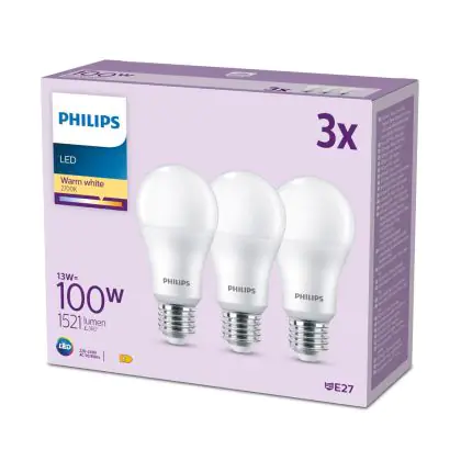 Die Mehrfachpackung 3x Philips Glühbirne LED E27 Birne Matt 13W 1521lm - 827 Extra Warmweiß ist eine effiziente E27 LED-Lampe und der perfekte Ersatz für Ihre konventionellen W Lampen mit E27-Sockel. Zudem strahlt sie Licht in der Farbtemperatur 2700K - Extra Warmweiß aus und punktet durch eine lange Lebensdauer.