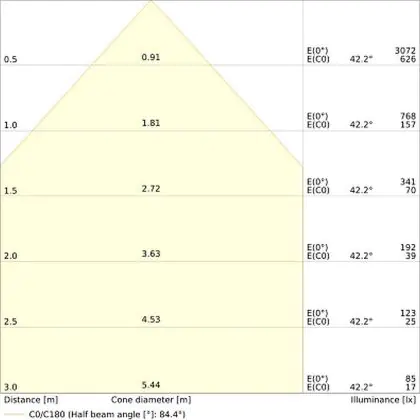 Der Abstrahlwinkel bezeichnet den Winkel, in dem das Licht aus der Lichtquelle ausgestrahlt wird. Er wird in Grad (D) angegeben. Je geringer die Gradzahl des Abstrahlwinkels ist, desto kleiner ist auch der Durchmesser des Lichtkegels, den die Lichtquelle produziert. Beispiel: Wird eine Lampe mit einem Abstrahlwinkel von 60 Grad an der Decke (2,5 m Höhe) angebracht, erzeugt sie einen Lichtkegel von 2,9 Metern Durchmesser. Hat die Lampe hingegen einen Abstrahlwinkel von 120 Grad, beträgt der Lichtkegel 8,7 Meter im Durchmesser. |