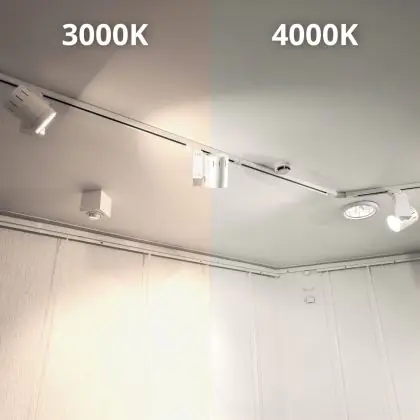 Der LED-Schienenstrahler kommt mit der Farbtemperatur 4000K - Kaltweiß daher. Als Faustregel gilt: Je niedriger der Kelvinwert, desto gemütlicher wirkt das Licht.